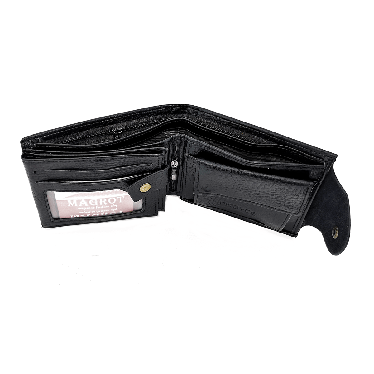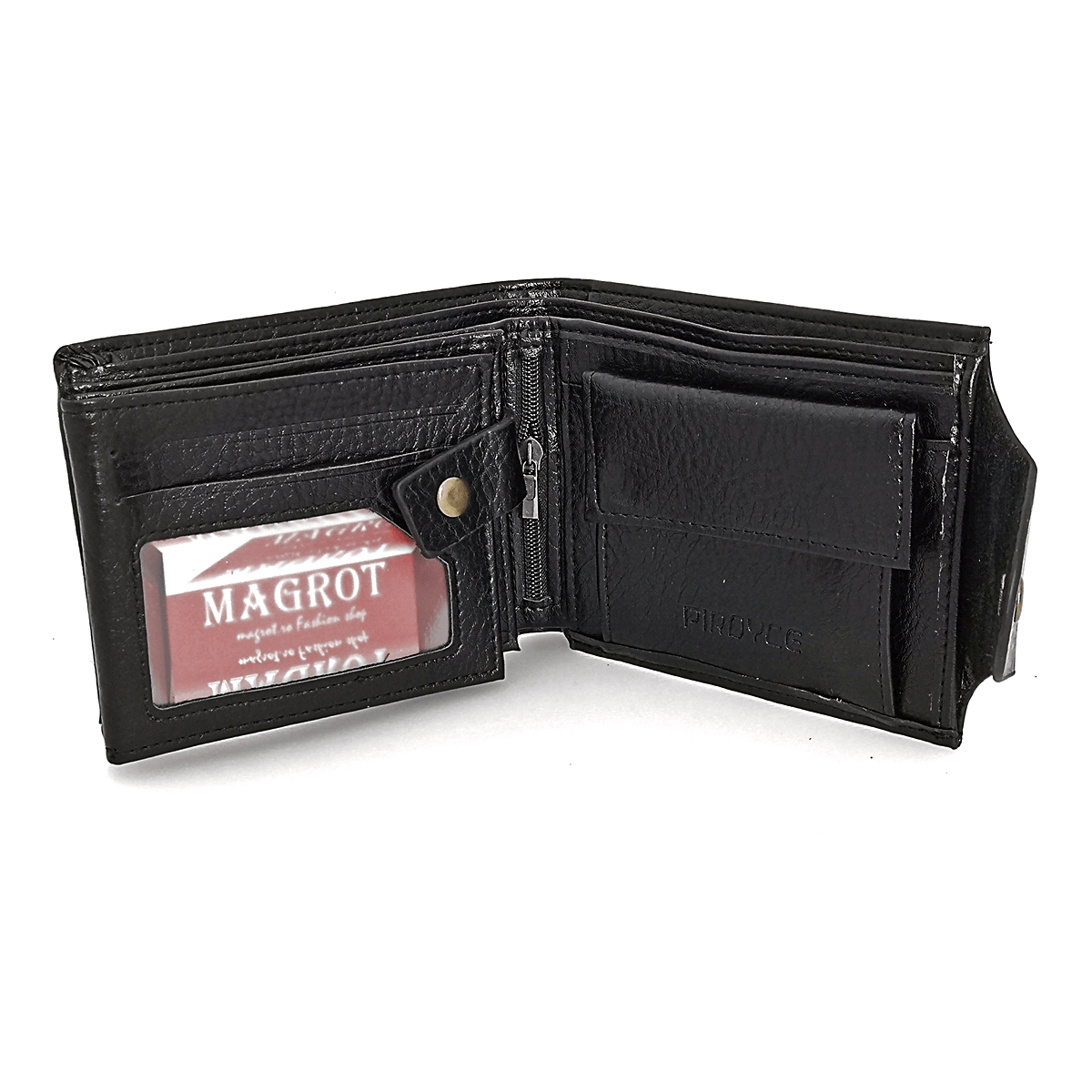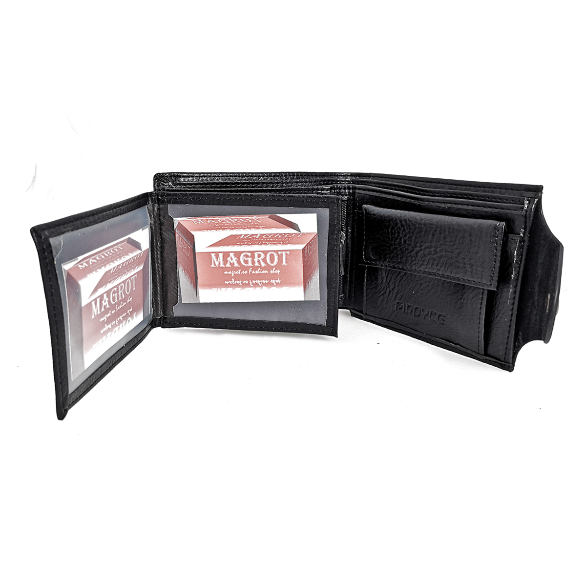 Portofel Magrot negru din piele, elegant și durabil, perfect pentru organizarea banilor și cardurilor. Dimensiuni: 13 x 3 x 10 cm (lungime/lățime/înălțime); Compartimentare: 5 spații pentru carduri; 1 fereastră pentru buletin și permis; 1 compartiment pentru monede; 2 compartimente pentru bancnote; 1 compartiment cu fermoar ascuns; Material: Piele pu; Culoare: negru alte culori aici