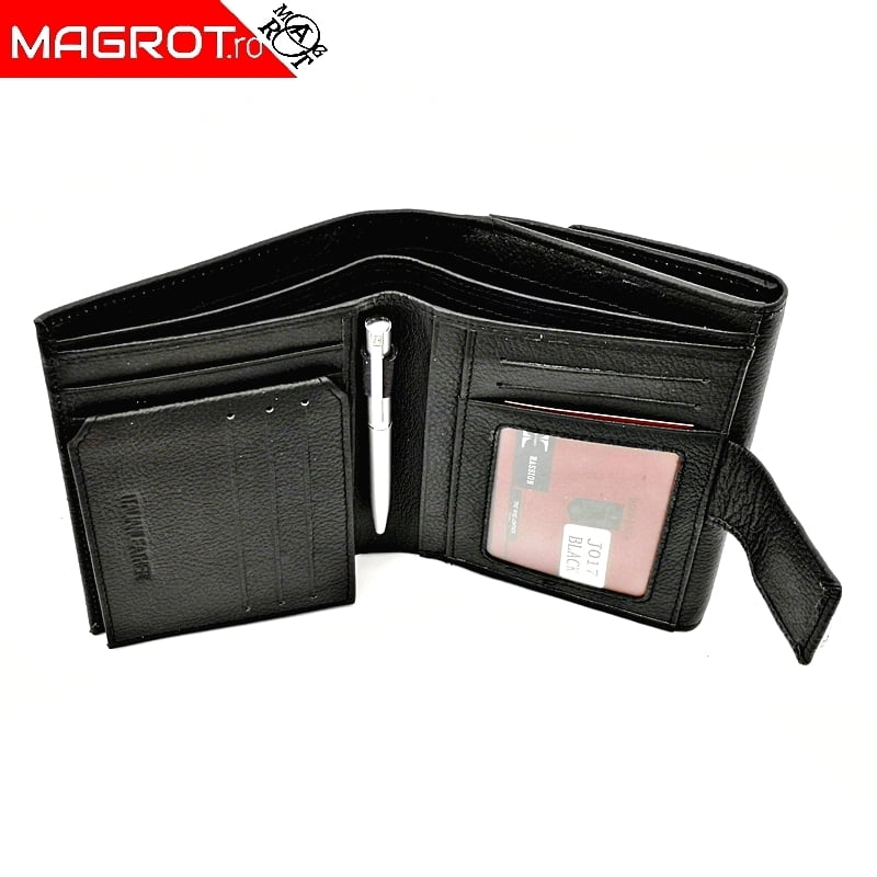 Portofelul dama J017 negru este un produs modern si elegant. Acesta este realizat din piele naturala de inalta calitate . Aare un compartiment principal, un buzunar frontal si un buzunar spate. Portofelul are, de asemenea, un numar mare de buzunare interioare, buzunare pentru carduri si buzunare pentru monede. Acest portofel este ideal pentru a va organiza si a va proteja bunurile intr-un mod stilat si modern Se deschide in doua parti egale pe o parte iar la interior are diferite compartimente. Pe partea din spate se deschide un buzunar mare cu capsa pentru monede. Compartimentare partea din fata: 2 buzunare mari pentru bancnote 3 buzunare transparente pentru permis/ legitimatie 5 buzunare pentru carduri 4 buzunare pentru acte Compartimentare partea din spate: 1 buzunar pentru monede cu doua compartimente cu inchidere cu capsa Inchidere cu magnet pe o parte si cu capsa pe cealalta parte. Dimensiuni inchis: Latime: 11 cm , Inaltime: 14,3 cm Dimensiuni deschis: Latime: 21,5 cm , Inaltime: 14,3 cm Portofelul este de dimensiuni mici putand fi purtat si intr-o genanta mica. Datorita pixului atasat portofelului nu va veti mai faceti grij atunci cand vreti sa notati ceva. Acest portofel poate fi un cadou frumos si util pentru cei dragi fiind livrat intr-o cutie eleganta, rosie cu sigla “ROMANIA HASSION”.